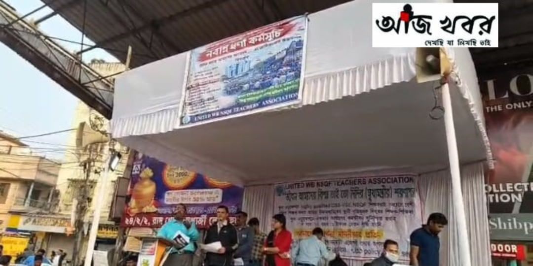আজ খবর (বাংলা) (রাজ্য), হাওড়া, পশ্চিমবঙ্গ, ২১/০১/২০২৬ : ইউনাইটেড ওয়েস্ট বেঙ্গল এনএসকিউএফ টিচার্স এসোসিয়েশনের ডাকে নবান্নের সামনে ধরনা। আজ সকাল থেকে কড়া পুলিশি নিরাপত্তার মধ্যে মন্দিরতলা বাস স্ট্যান্ডে ধর্না এবং বিক্ষোভ প্রদর্শন করেন কারিগরি শিক্ষা বিষয়ে শিক্ষকরা।