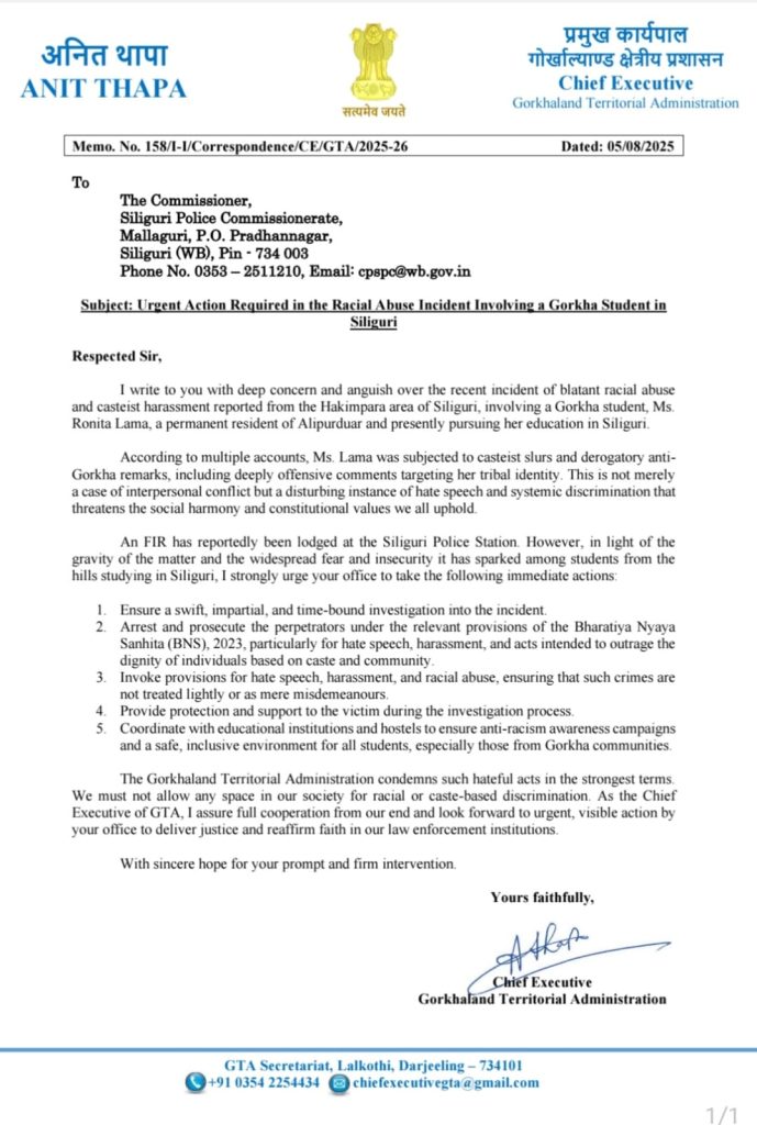 জিটিএ প্রধান অনিত থাপা  জানিয়েছেন, তাঁর কাছে এই ব্যাপারে একটি অভিযোগ এসে পৌঁছেছে। শিলিগুড়ির হাকিমপাড়া এলাকার একটি শিক্ষা প্রতিষ্ঠানে একটি গোর্খা ছাত্রকে হেনস্থা করা হয়েছে এবং তাকে জাতিগতভাবে ঘৃণামূলক মন্তব্য করা হয়েছে।  এই ধরনের ঘটনার ফলে পাহাড়ের ছাত্রছাত্রীরা সমতলে পড়াশুনা করতে ভয় পেতে পারে।