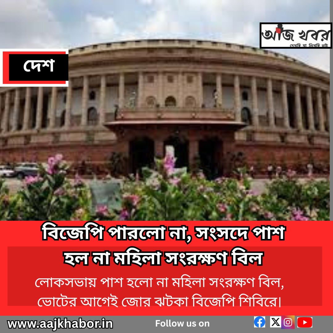 আজ খবর (বাংলা), [দেশ], নতুন দিল্লী, ভারত,১৮/০৪/২০২৬ : লোকসভায় পাশ হলো না মহিলা সংরক্ষণ বিল, ভোটের আগেই জোর ঝটকা  বিজেপি শিবিরে।